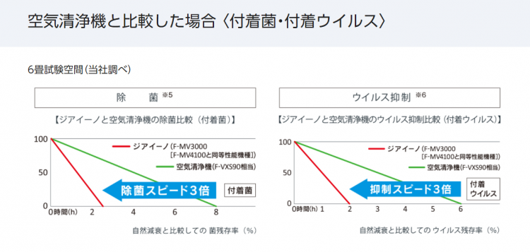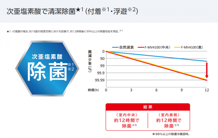 ※5:【試験機関】(株)環境管理センター【試験方法】臭気強度表示法による検証【脱臭の方法】 次亜塩素酸 空間除菌脱臭機 (2017年度F-MV3000[F-MV4100と同等性能機種]) を風量「強」・電解強度「強」 運転で実施 。