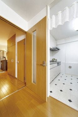 明るくて広いリビング・ベッドで寝起きしたいとのご要望でした。築35年の建具枠と現在市販の建具はサイズが合わないため、建具を造作することで壁を壊さずにコストを抑えて建具の入替えを実現できました。
