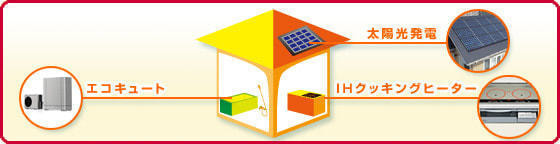 オール電化リフォームとは、「太陽光発電」 「IHクッキングヒーター」 「エコキュート」を用いて、照明、空調、 給湯、調理などの熱源を電気でまかなう住宅リフォームのことです。また、余った電力は電力会社に売ることができたり、安い深夜電力が上手に使えたり、電力会社より10%の割引きが受けられるなど、 さまざまな経済的メリットも魅力です。