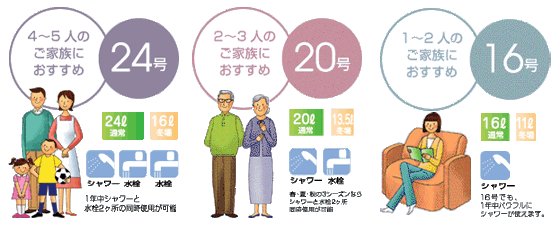 家族の人数や、同時にどのくらいお湯を使うかなどを考えて適当な号数を選びましょう。