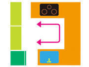 I型とは、シンク・コンロ台・調理台を横並びに配置するタイプです。作業がすべて横移動となるため、シンク・ガスコンロ台・調理台の位置関係(=順序)やスペース取りが大切になります。シンクや調理スペースが狭くならないように注意を払わないといけません。よくDKで採用される型で、シンク・冷蔵庫・ガス台または、IHヒーターを一直線に並べた最も基本的な配置です。全体の長さが長すぎると横歩き作業の連続となるので、疲れやすい型です。