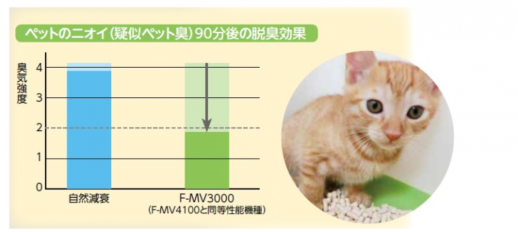※5:【試験機関】(株)環境管理センター【試験方法】臭気強度表示法による検証【脱臭の方法】 次亜塩素酸 空間除菌脱臭機 (2017年度F-MV3000[F-MV4100と同等性能機種]) を風量「強」・電解強度「強」 運転で実施 。